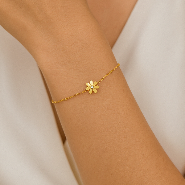 The Daisy Bracelet embodies pure joy and gentle optimism, capturing the lighthearted beauty of new beginnings. Its delicate gold chain and dainty flower charm serve as a reminder to bloom with grace wherever you are. Perfect for layering with other minimal pieces or wearing solo for a subtle touch of sunshine.