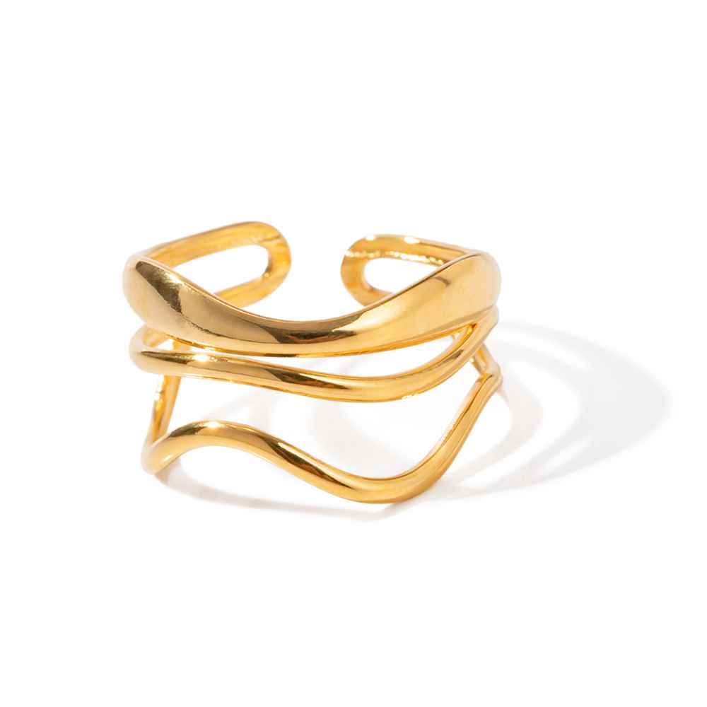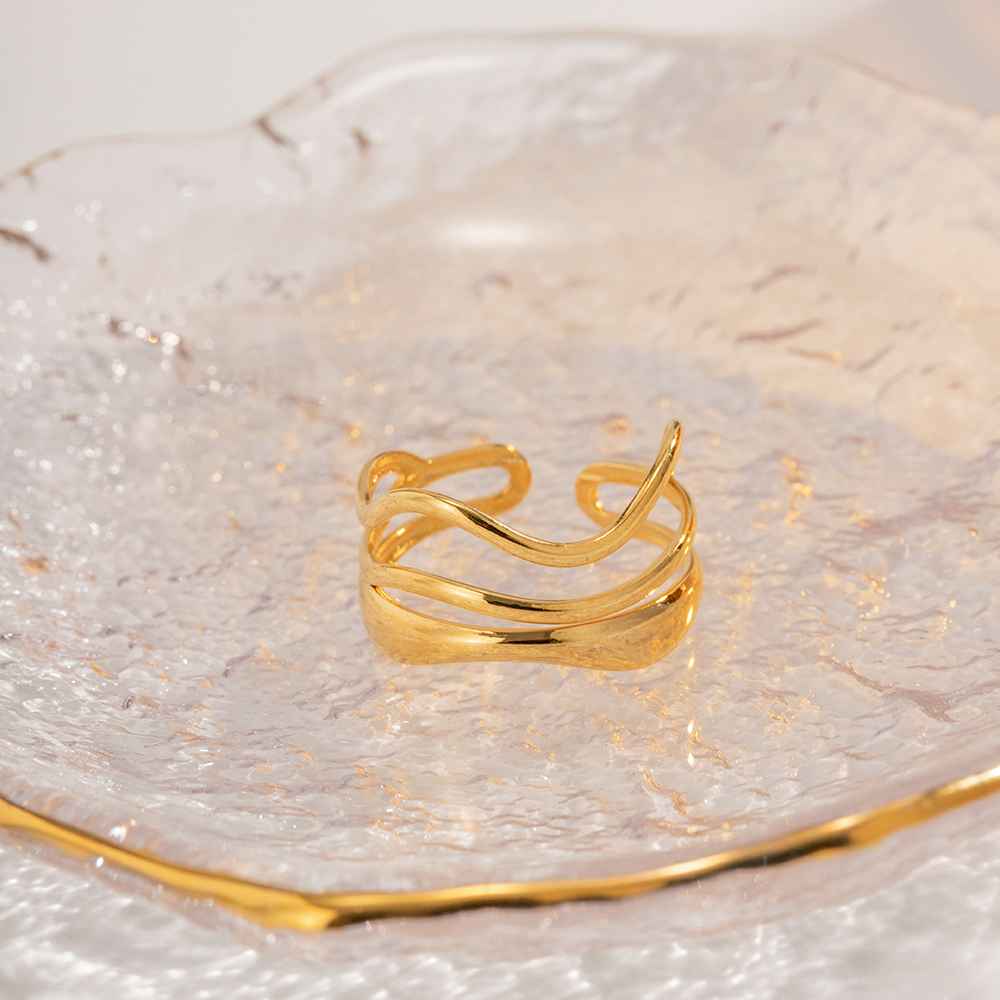 This sculptural gold ring features fluid, layered curves that create a bold yet elegant statement. Its open, adjustable design offers a comfortable fit while adding a modern, artistic touch to any look.