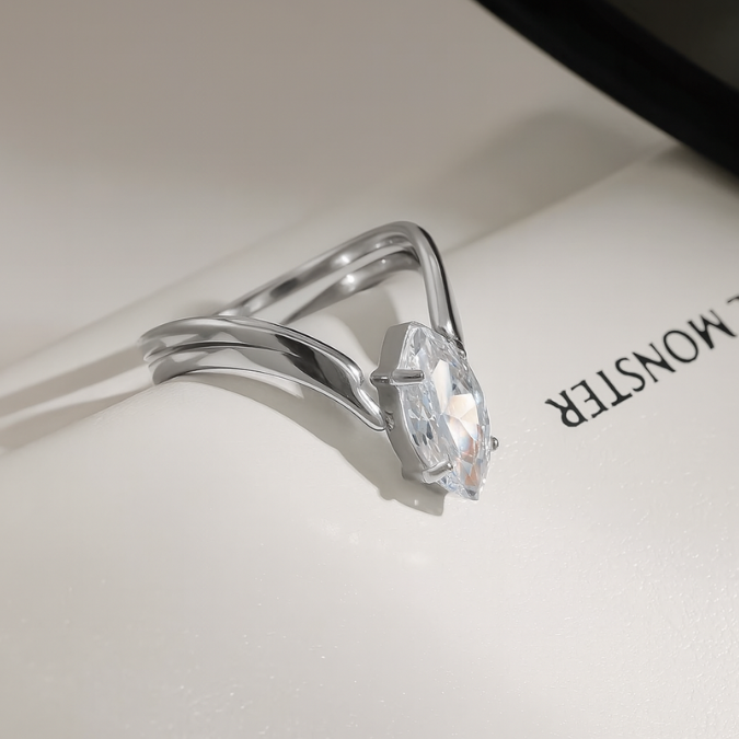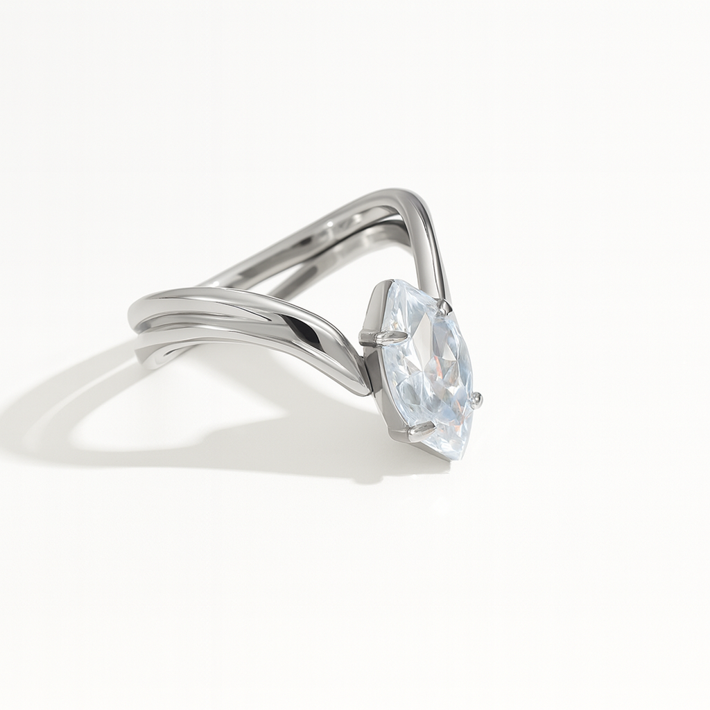 The Isla Ring is a symbol of clarity and strength, featuring a brilliant marquise-cut crystal set on a fluid silver band that embodies grace in motion. Its modern minimalist design reflects quiet confidence and timeless elegance. Pair it with a sleek manicure or silver hoops for a refined, everyday-luxury look.