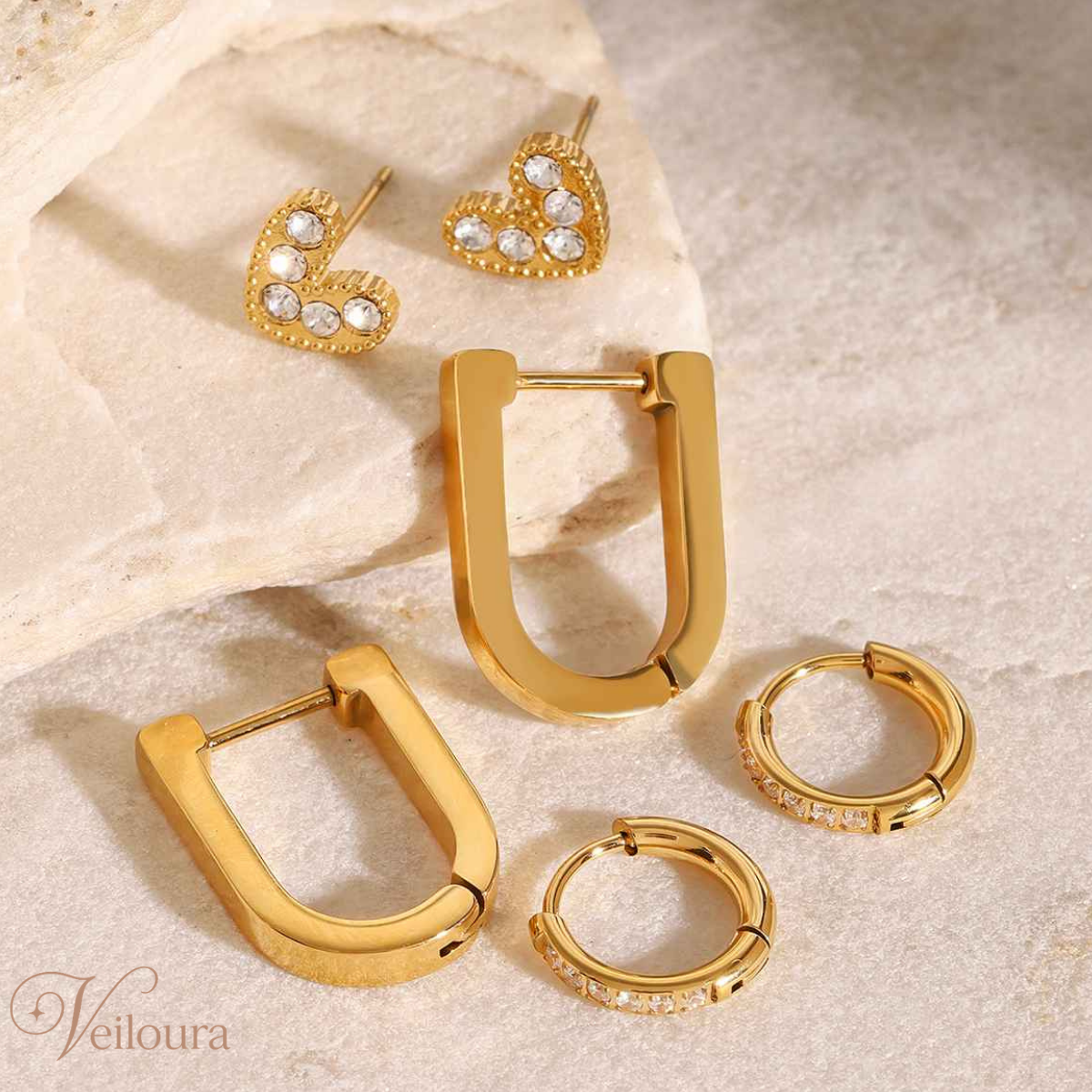A versatile 3-piece earring set featuring a mix of heart studs, round hoops, and modern U-shaped huggies.