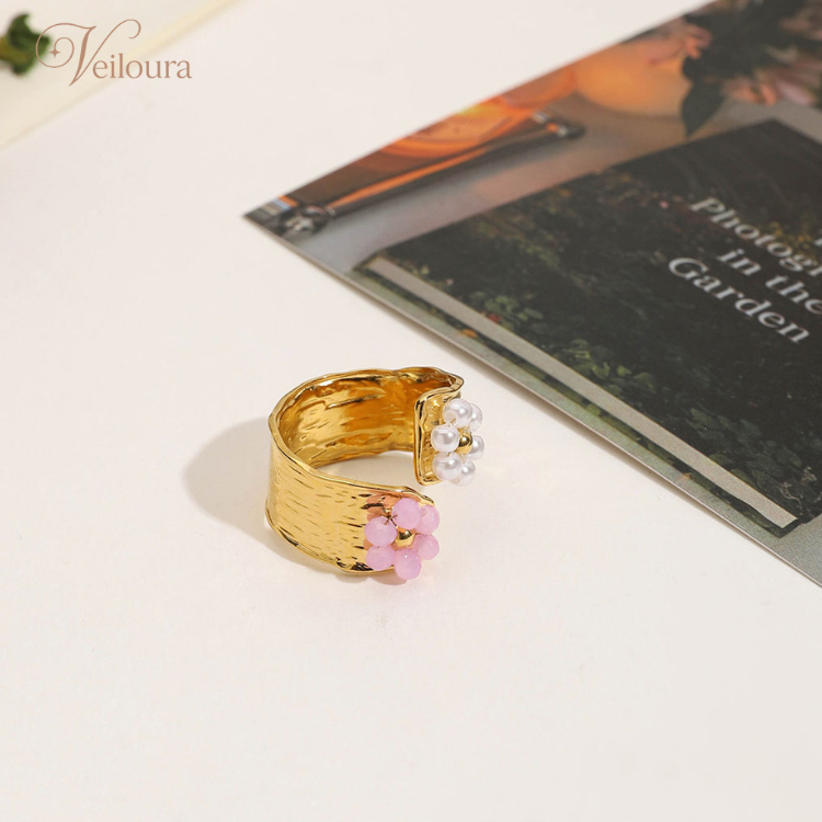 This gold statement ring features two dainty flower accents — one made of pink beads and the other with white pearls — on a hammered, open-band design.