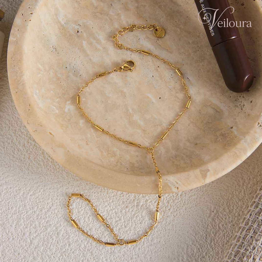 This dainty gold hand chain bracelet is the perfect blend of elegance and modern flair. Designed with delicate bar details, it effortlessly connects your ring and wrist for a touch of luxury. Pair it with gold rings or a minimalist manicure for a chic, feminine statement.