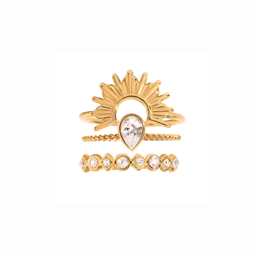 Shine bright with this stunning gold ring set featuring a radiant sunburst design and sparkling crystal accents. Crafted from waterproof, hypoallergenic stainless steel, it exudes elegance and durability.
